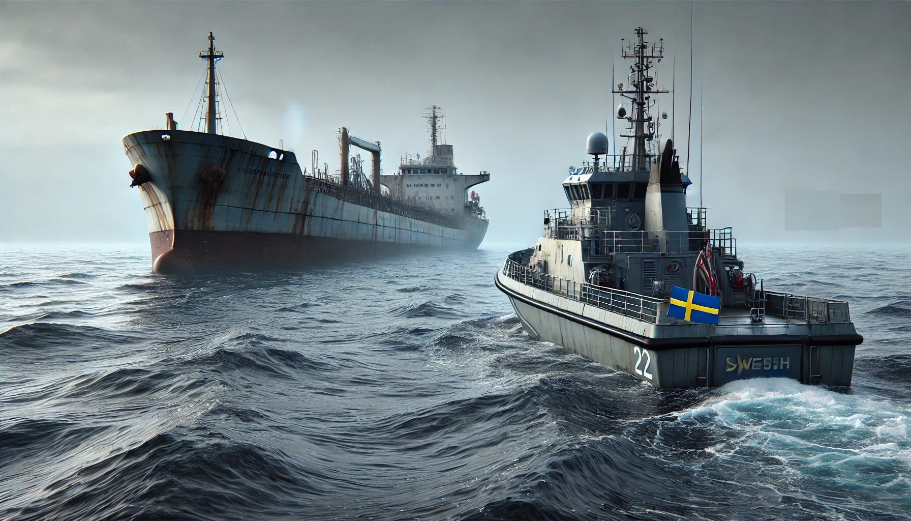An AI image of a Swedish patrol boat approaching a suspected ghost fleet tanker in the Baltic Sea.